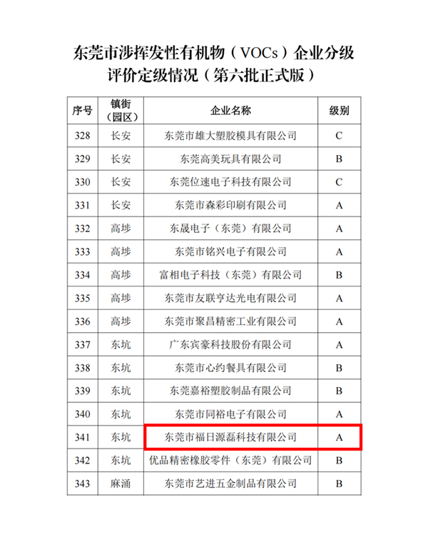 近日,東莞市生態(tài)環(huán)境局公布第六批涉揮發(fā)性有機物(VOCs)企業(yè)分級評價結(jié)果。福日電子成員企業(yè)源磊科技憑借規(guī)范完備的治理體系與持續(xù)向好的環(huán)保成效,成功獲評最高等級——A級企業(yè),環(huán)境管理能力躋身行業(yè)與區(qū)域的標(biāo)桿行列。